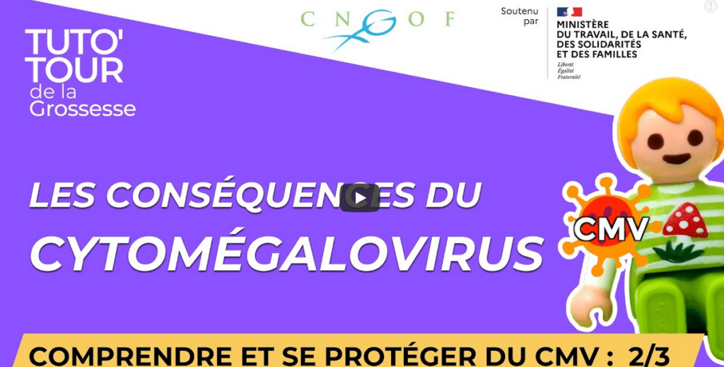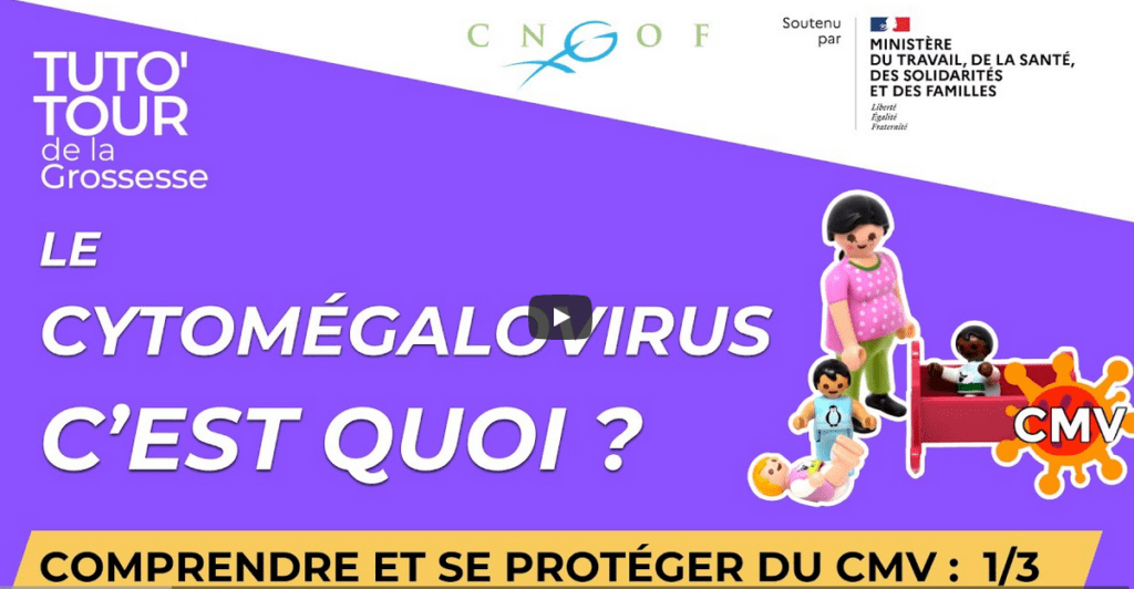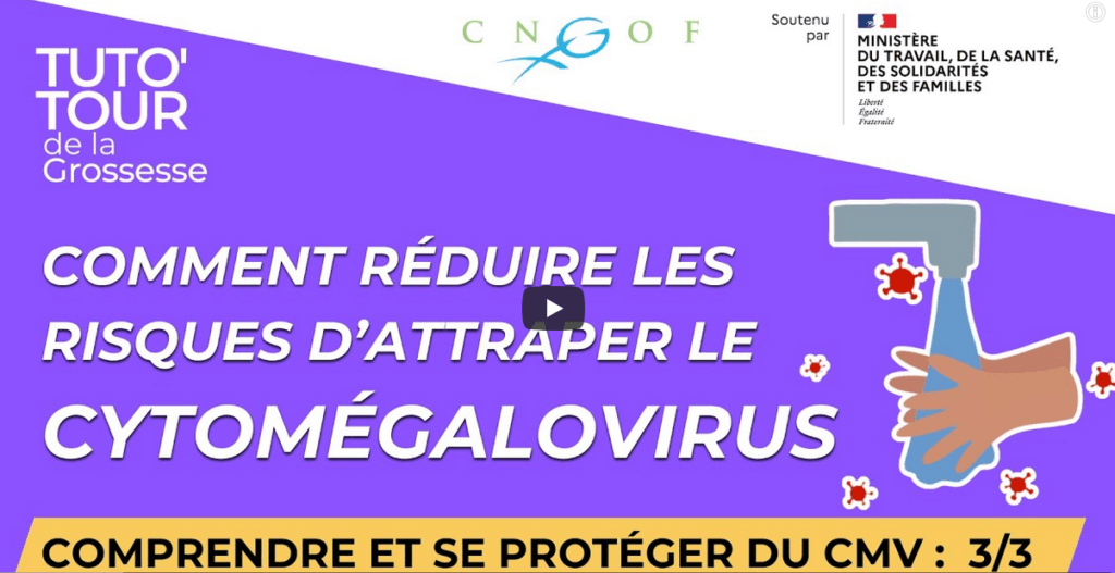 Dans le cadre du Tuto’Tour de la grossesse, dispositif national d’information soutenu par le Collège National des Gynécologues et Obstétriciens Français (CNGOF) et le ministère de la Santé, trois courtes vidéos ont été réalisées pour mieux comprendre le CMV et apprendre à s’en protéger.